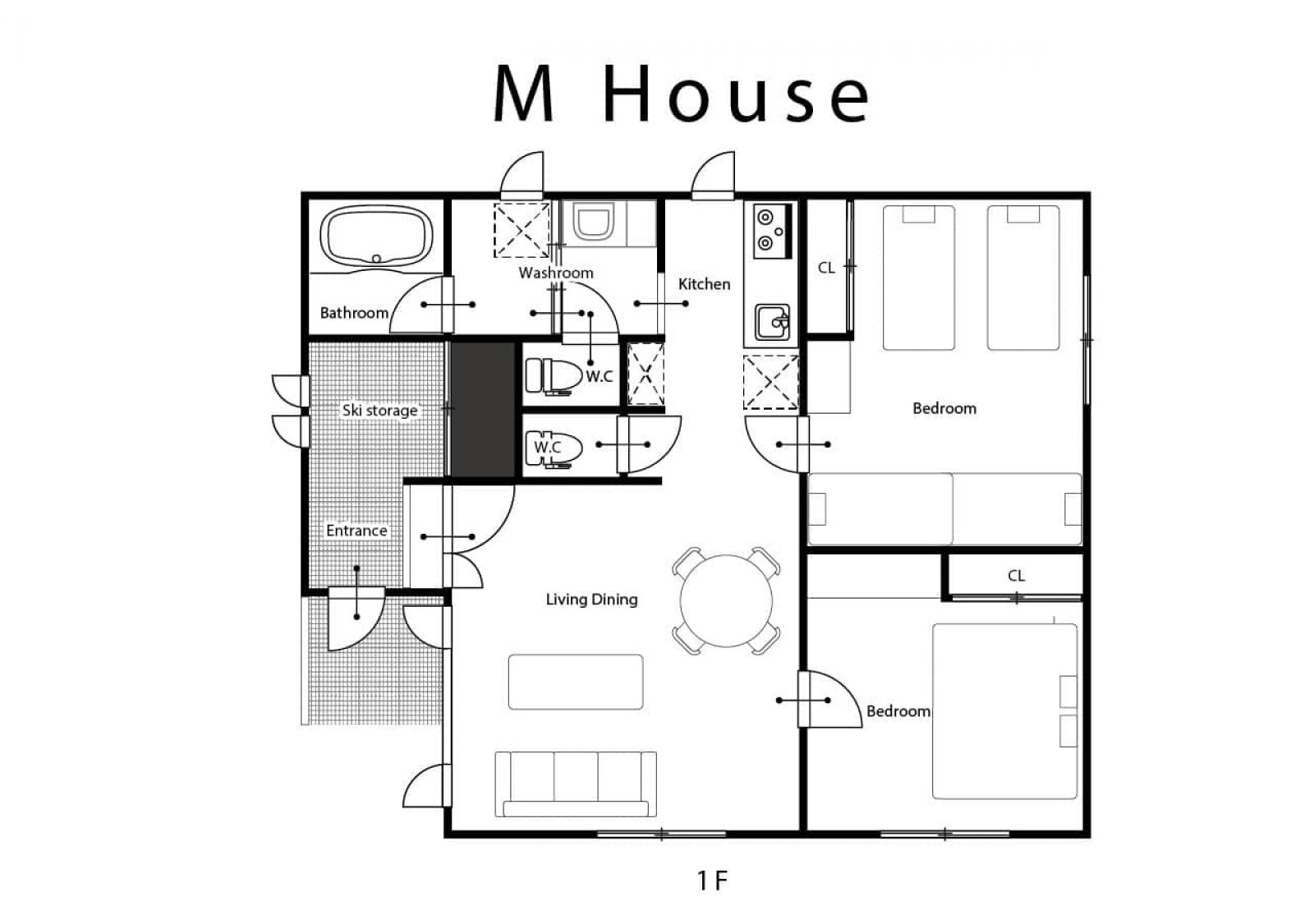 M House Furano is a newly renovated and beautifully appointed modern holiday rental house which can accommodate up to six people. It is conveniently located in the centre of Furano’s downtown area and within walking distance to restaurants, cafes, bars, bus stops, supermarkets and convenience stores. The house has 2 bedrooms, 1 bathroom, 2 toilets, a spacious living and dining area and a modern kitchen. The entrance-hallway has spacious ski storage and drying racks to keep your ski gear organised and easily accesible. The Kitanomine ski area is 5 minutes by car and Furano Ski area is a 10-minute drive away. A hospitable and friendly property management team with English speaking staff will welcome you upon your arrival and provide you with comprehensive information on the house’s amenities and Furano and its surrounding areas. They will also be providing you with support throughout your stay.